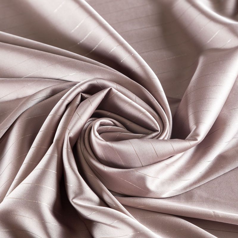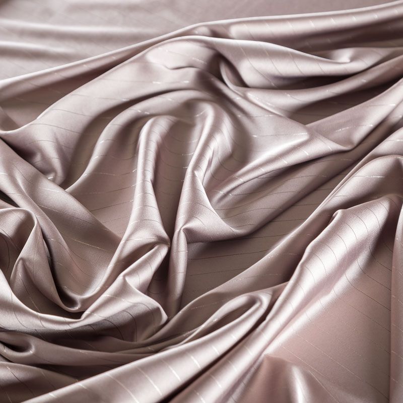 Тонкая, легкая, струящаяся ткань, декорированная тонкими вертикальными полосками люресовой нити, не просвечивает, очень нежная и прятная к телу, обладает благородным атласным блеском, хорошо драпируется, тянется за счет эластана в составе. Идеально подойдет для пошива блузок, платьев и юбок, а также топов, платков, домашней одежды.
