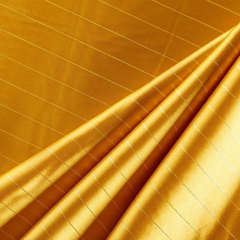 Тонкая, легкая, струящаяся ткань, декорированная тонкими вертикальными полосками люресовой нити, не просвечивает, очень нежная и прятная к телу, обладает благородным атласным блеском, хорошо драпируется, тянется за счет эластана в составе. Идеально подойдет для пошива блузок, платьев и юбок, а также топов, платков, домашней одежды.