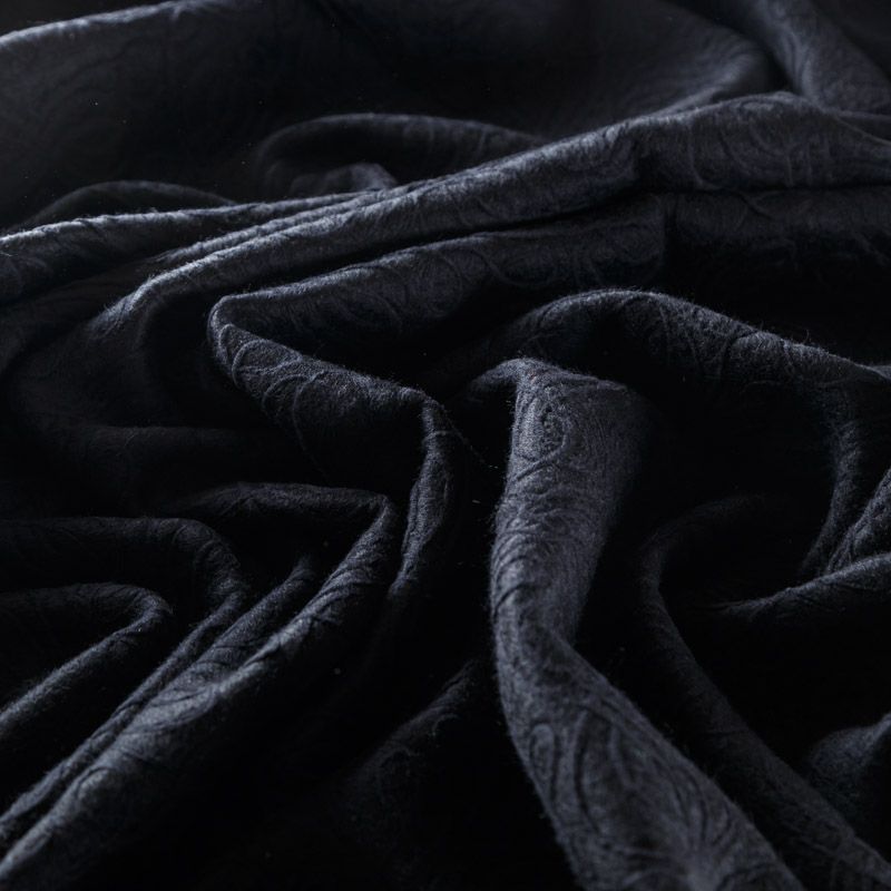 Итальянская фактурная шерсть в черном цвете. Ткань хорошо держит форму, приятная на ощупь, гибкая, средней толщины, при этом высокой плотности. Подойдет для пошива теплого костюма, юбки, пальто, куртки, жакета, парки, кейпа, жакета или пончо.