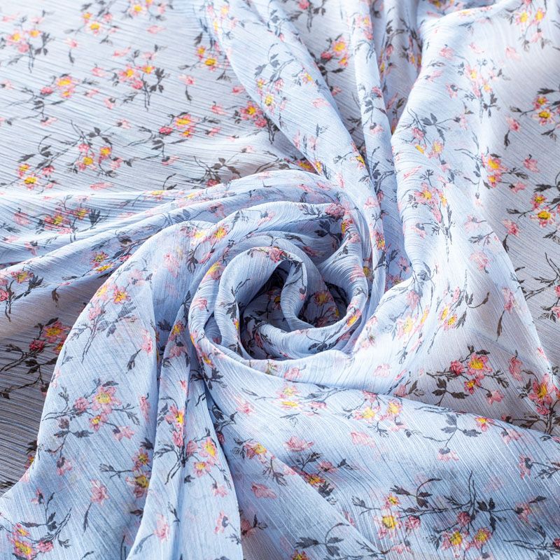 Шифон-жатка голубого оттенка с мелким цветочным принтом. Струящийся, летящий, воздушный, полупрозрачный. На ощупь мягкий и приятный. Подойдет для пошива тончайших воздушных блуз, изумительных платьев со сборками и воланами и элегантных шарфов.