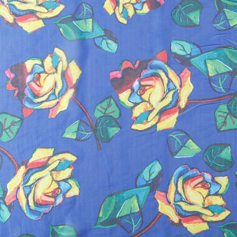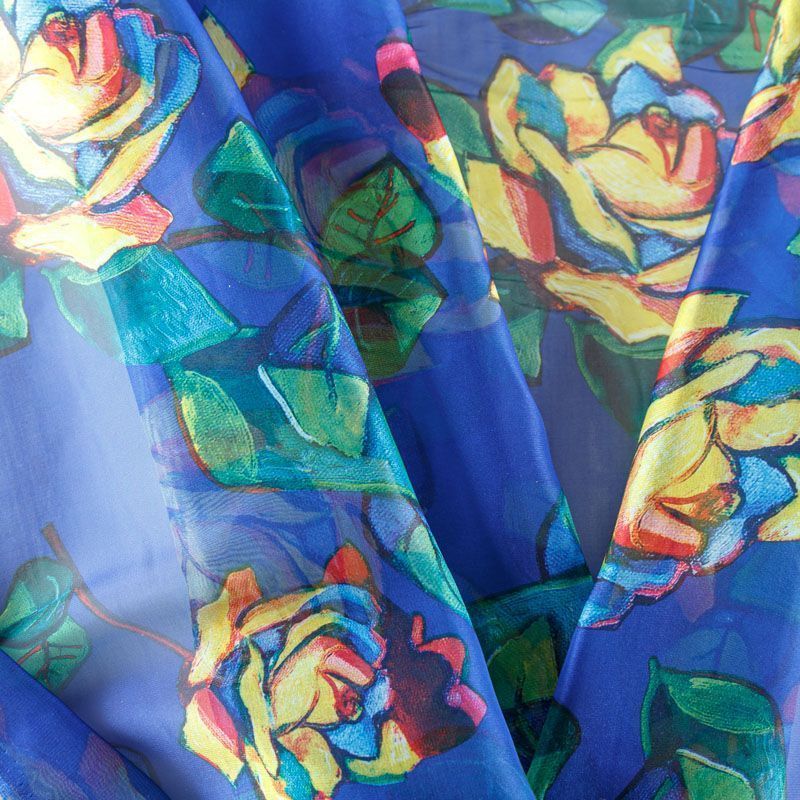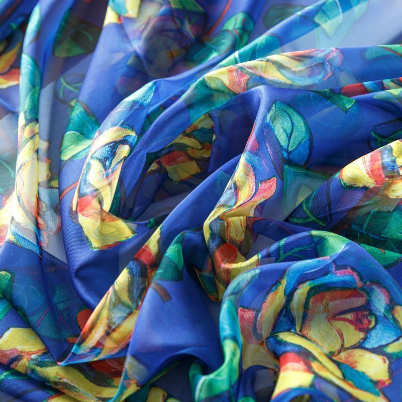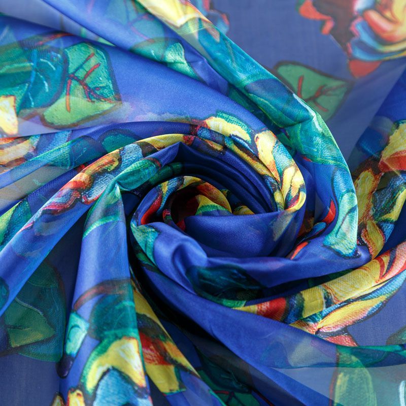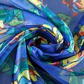 Шифон синего оттенка со стилизованным цветочным принтом. Струящийся, летящий, воздушный, полупрозрачный. На ощупь мягкий и приятный. Подойдет для пошива тончайших воздушных блуз, изумительных платьев со сборками и воланами и элегантных шарфов.