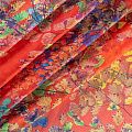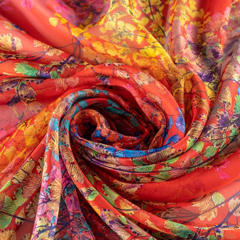 Шифон красного цвета с мелким растительным принтом в ярких оттенках. Струящийся, летящий, воздушный, полупрозрачный. На ощупь мягкий и приятный.Подойдет для пошива тончайших воздушных блуз, изумительных вечерних платьев и элегантных шарфов.