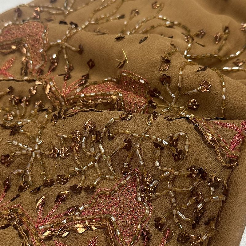 Шифон шелковый с вышивкой 068-20795 карамельный ОСТАТОК 1,3 метра в Уфе