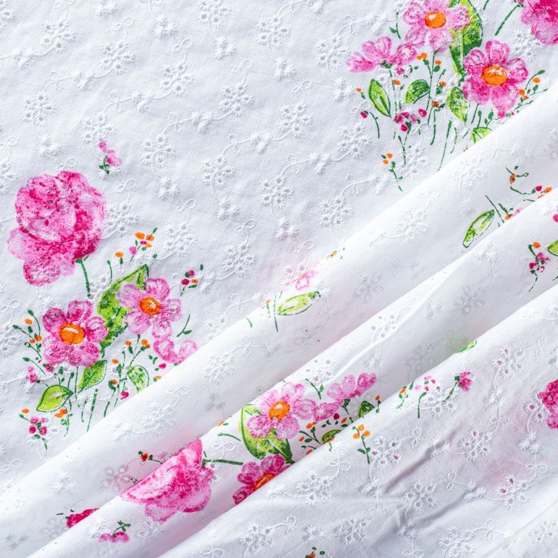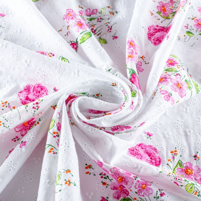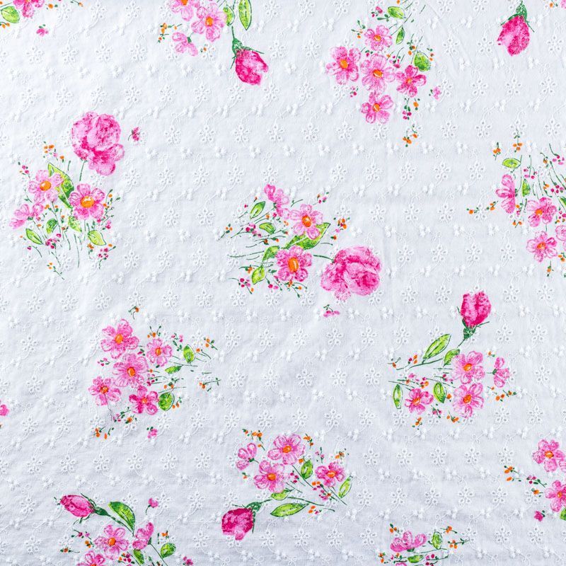 Тренд и мастхэв этого лета - итальянское шитье-ришелье на хлопковой основе. На белом фоне яркий принт в виде небольших цветочных букетов. Вышивка расположена по всему полотну. Ткань мягкая, чуть держит форму, приятная на ощупь, слегка просвечивает. Идеально подойдет для пошива рубашки, блузы, топа в воланами, туники, платья, сарафана, юбки.