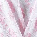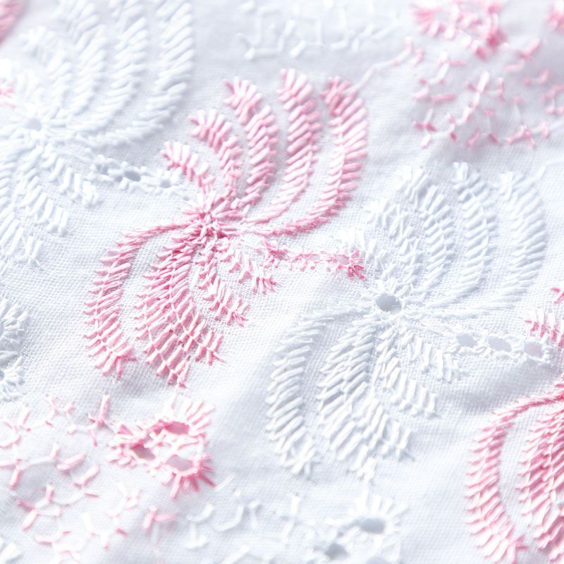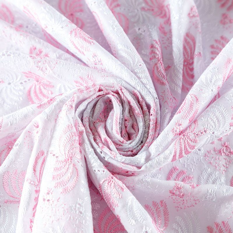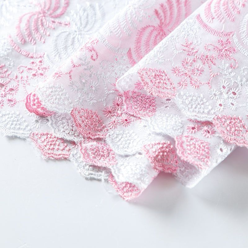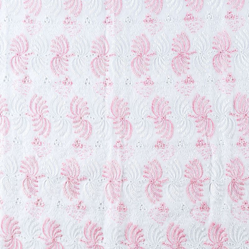 Мягкая, тонкая основа белого цвета с вышивкой глянцевой нитью белого и розового оттенка. Ткань не мнется, воздушная, слегка прозрачная, не тянется, приятная на ощупь. Идеально подходит для создания летних платьев, сарафанов, юбок, блузок и топов. Кромка фигурная, фестон с двух сторон, ткань набирается объемом.