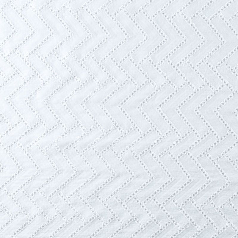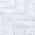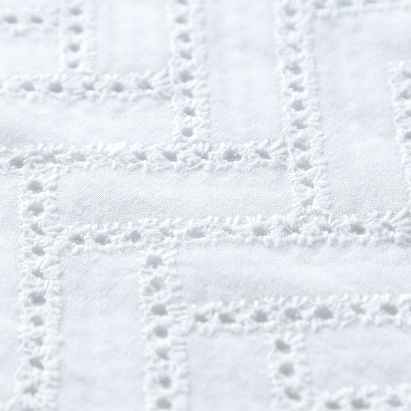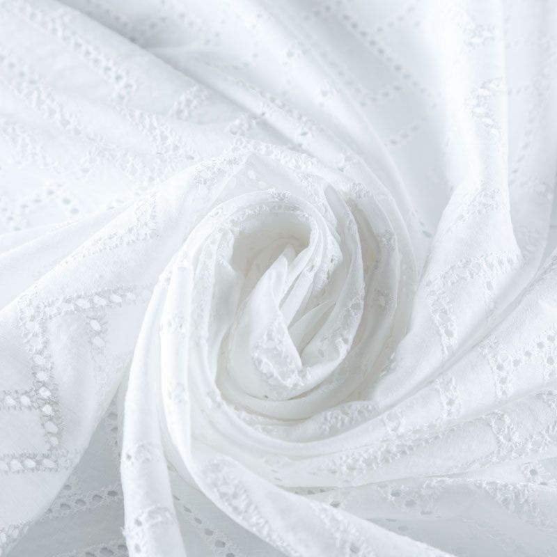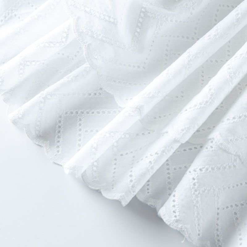 Итальянское шитье на белоснежной хлопковой основе с геометрической, элегантной вышивкой,  расположеннной по всему полотну. Ткань мягкая, легкая, пластичная, приятная на ощупь, просвечивает, потребуется подклад. Обе кромки ткани оформлены фигурными фестонами. Идеально подойдет для пошива рубашки, блузы, топа в воланами, туники, платья, сарафана, юбки, шорт.