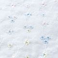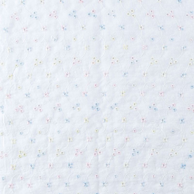 Мягкий и нежный хлопок белоснежного оттенка с вышивкой и перфорацией. Узор выполнен путём машинной вышивки разноцветными нитками и расположен по всему полотну. Фактура ткани однородная, имеет тенденцию к сминаемости, не тянется, приятная на ощупь. Может потребоваться подклад. Идеально подходит для создания летних платьев, сарафанов, юбок, блузок и топов.