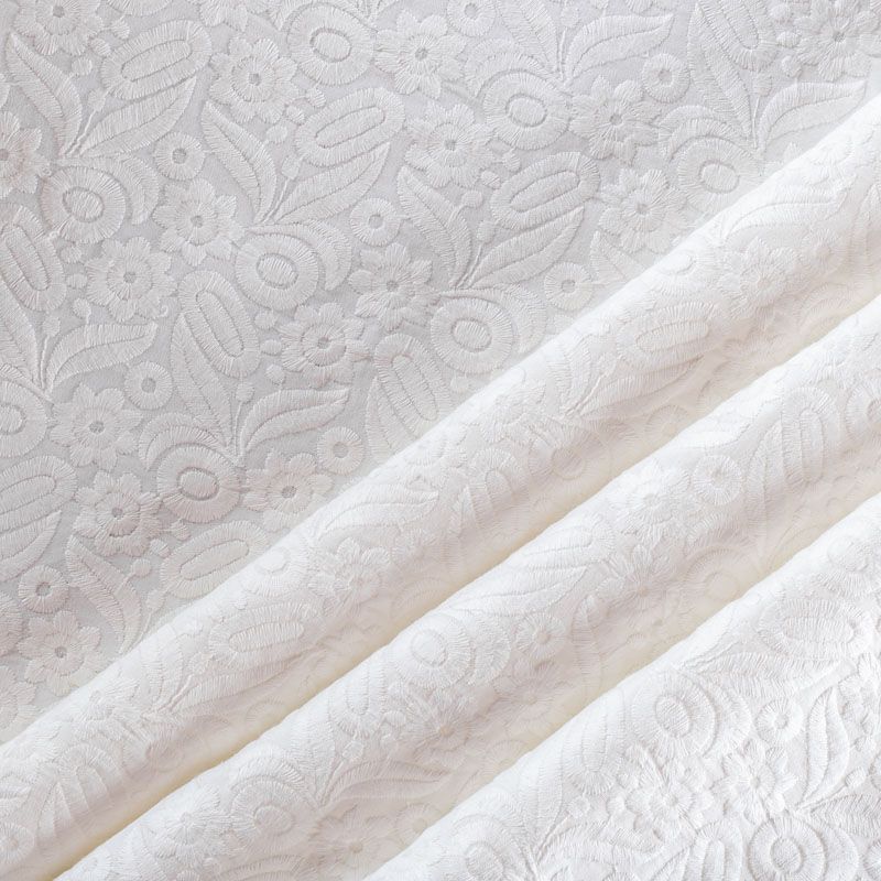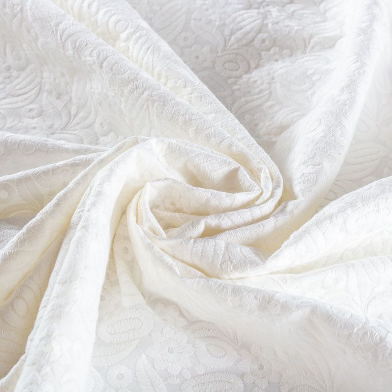 Итальянское шитье на белой хлопковой основе с плотной, не крупной, элегантной вышивкой,  расположеннной по всему полотну. Ткань мягкая, держит форму, приятная на ощупь, слегка просвечивает. Идеально подойдет для пошива рубашки, блузы, топа в воланами, туники, платья, сарафана, юбки, шорт.