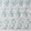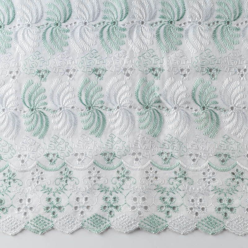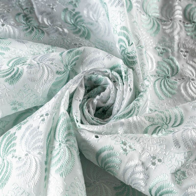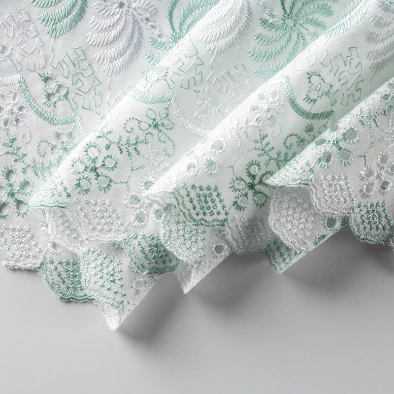 Мягкая, тонкая основа белого цвета с вышивкой глянцевой нитью белого и салатового оттенка. Ткань не мнется, воздушная, слегка прозрачная, не тянется, приятная на ощупь. Идеально подходит для создания летних платьев, сарафанов, юбок, блузок и топов. Кромка фигурная, фестон с двух сторон, ткань набирается объемом.