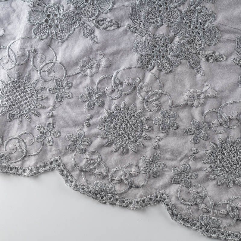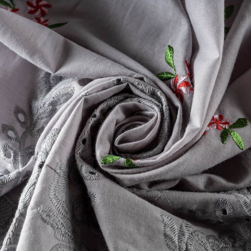 Мягкий хлопок серого цвета с яркой цветочной вышивкой. Фактура ткани гладкая, имеет тенденцию к сминаемости, немного просвечивает, не тянется, приятная на ощупь. Хлопок прекрасно пропускает воздух, идеально подходит для создания летних платьев, сарафанов, юбок, блузок и топов. Ткань идет купоном (каймой) вдоль одной кромки. Купон выполнен путём машинной вышивки нитками в цвет ткани. Набирается объемом.
