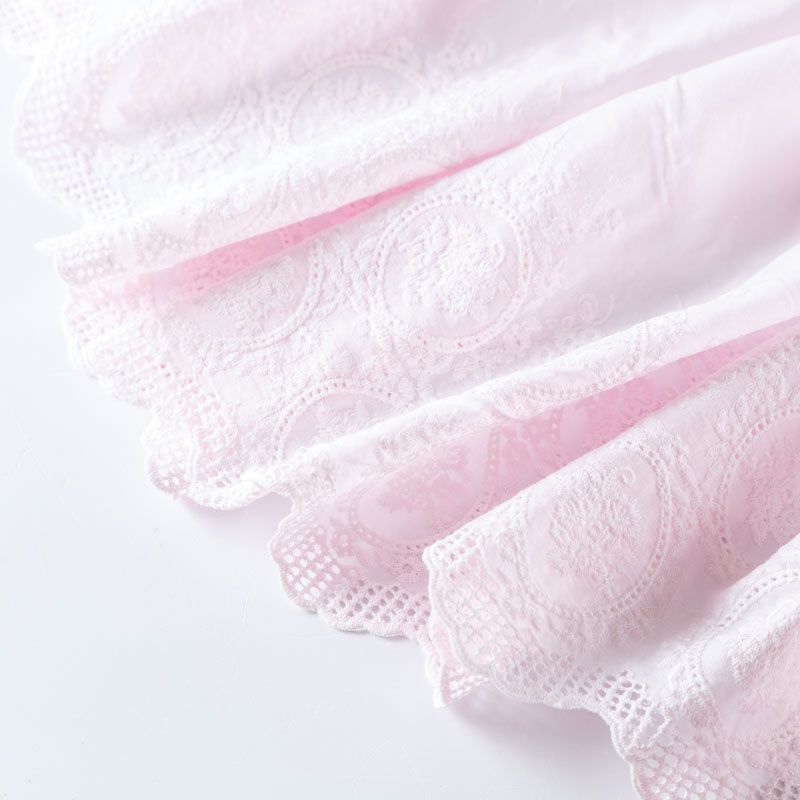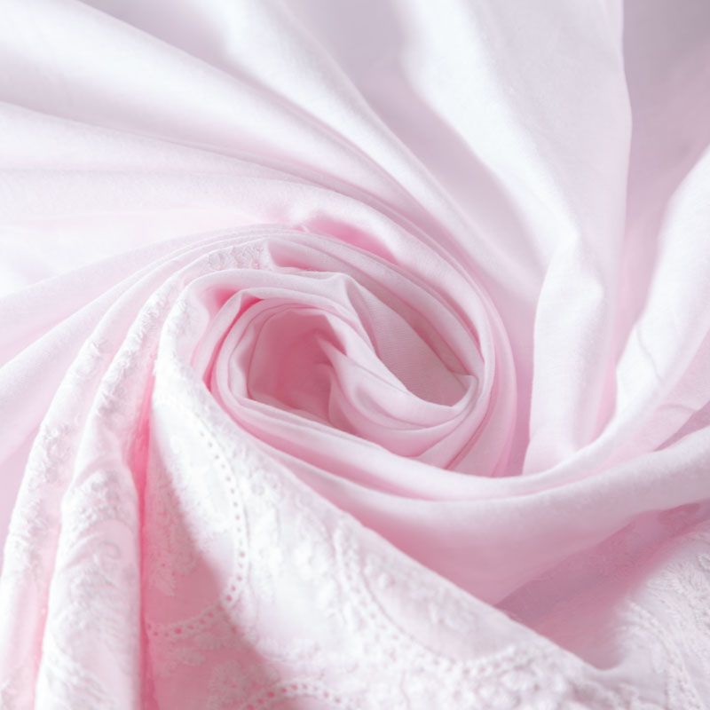 Мягкий и нежный хлопок розового оттенка с изящной вышивкой. Узор выполнен путём машинной вышивки нитками в цвет ткани и расположен вдоль кромки. Фактура ткани однородная, имеет тенденцию к сминаемости, просвечивает, не тянется, приятная на ощупь. Идеально подходит для создания летних платьев, сарафанов, юбок, блузок и топов.