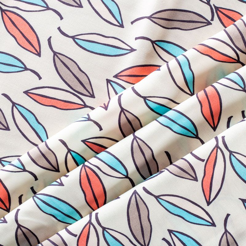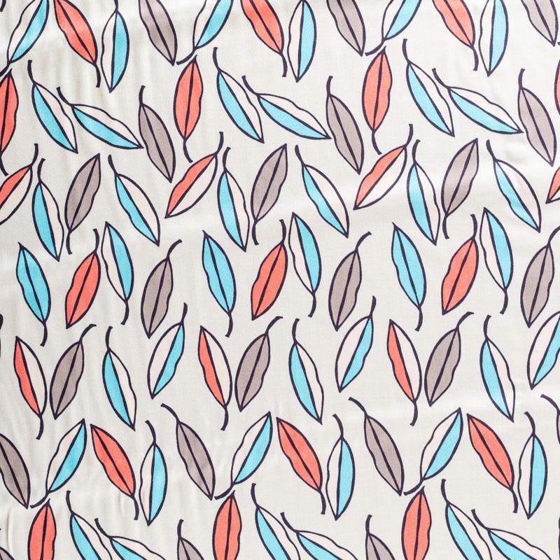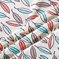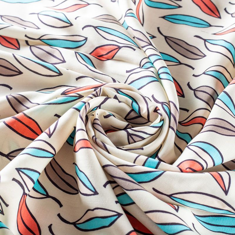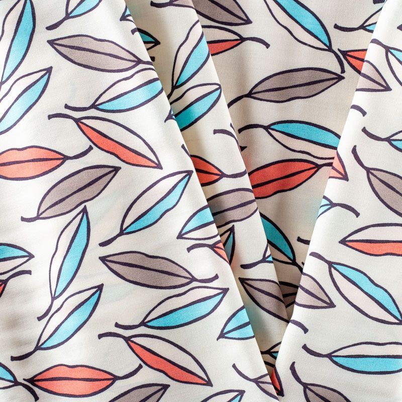Плательно-блузочный штапель с стилизованными листиками ярких оттенков на светлом фоне. Мягкий, тонкий, нежный, пластичный, приятный на ощупь, хорошо драпируется, практичный. Подойдет для пошива платья, топа, блузки, рубашки, юбки, летних брюк.