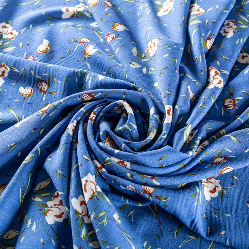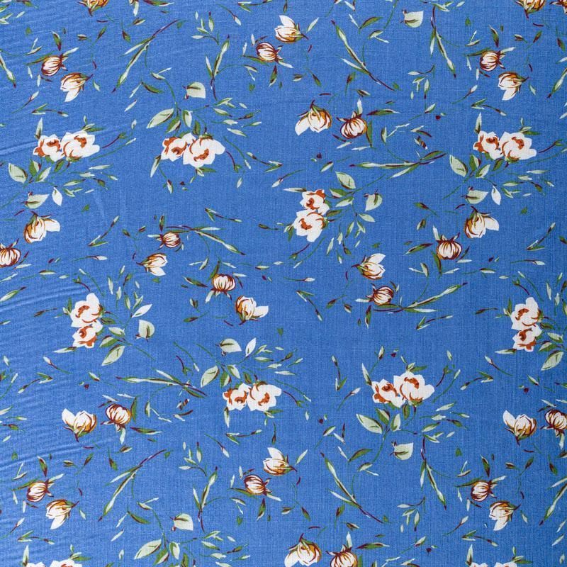 Плательно-блузочный штапель с цветочным принтом на темно-голубом фоне. Мягкий, тонкий, нежный, пластичный, приятный на ощупь, хорошо драпируется, практичный. Подойдет для пошива платья, топа, блузки, рубашки, юбки, летних брюк.