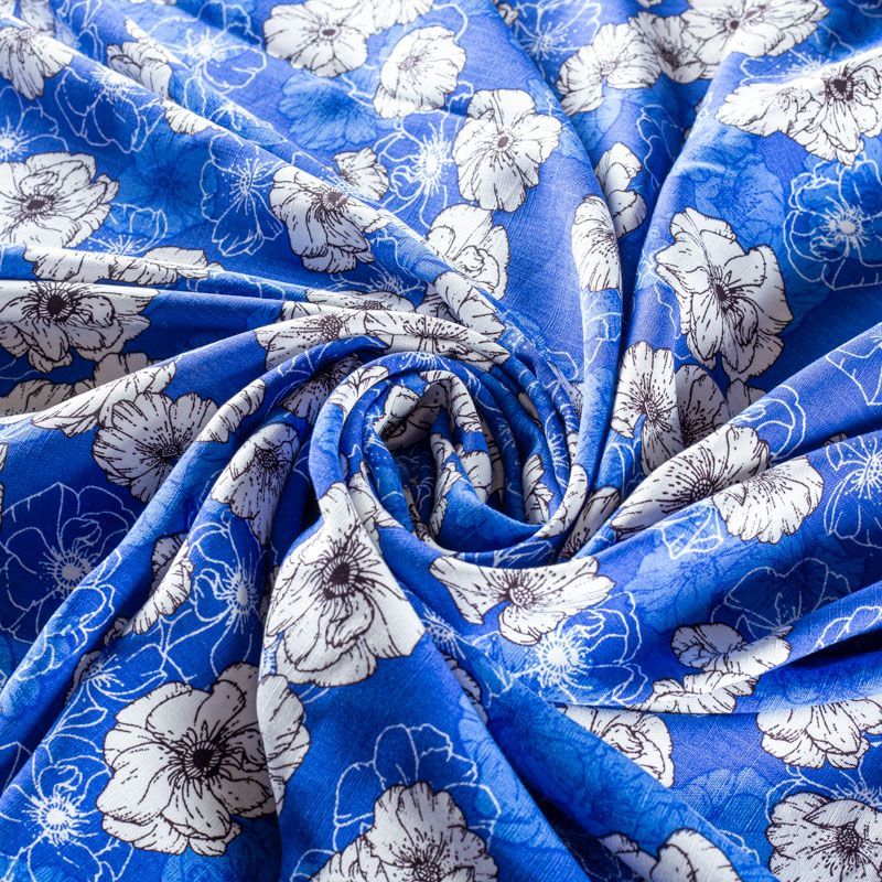 Плательно-блузочный штапель с черно-белым цветочным принтом на васильковом фоне. Ткань мягкая, тонкая, нежная, пластичная, приятная на ощупь, хорошо драпируется, практичная, поверхность слегка фактурная. Подойдет для пошива платья, топа, блузки, рубашки, юбки, летних брюк.