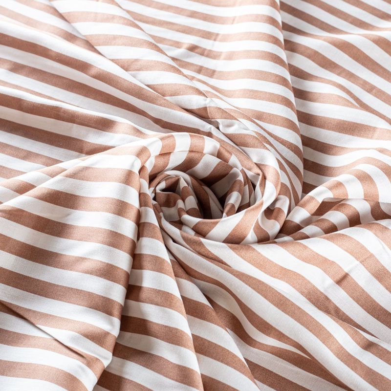 Плательно-блузочный штапель в вертикальную полоску средней ширины светло-коричневого оттенка. Ткань мягкая, тонкая, нежная, пластичная, приятная на ощупь, хорошо драпируется, практичная, поверхность слегка фактурная. Подойдет для пошива платья, топа, блузки, рубашки, юбки, летних брюк.