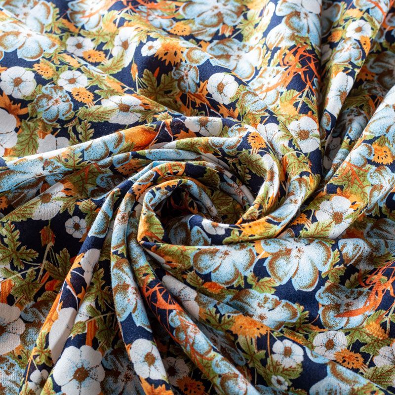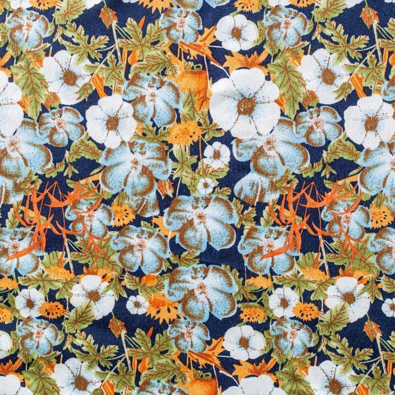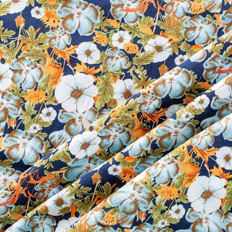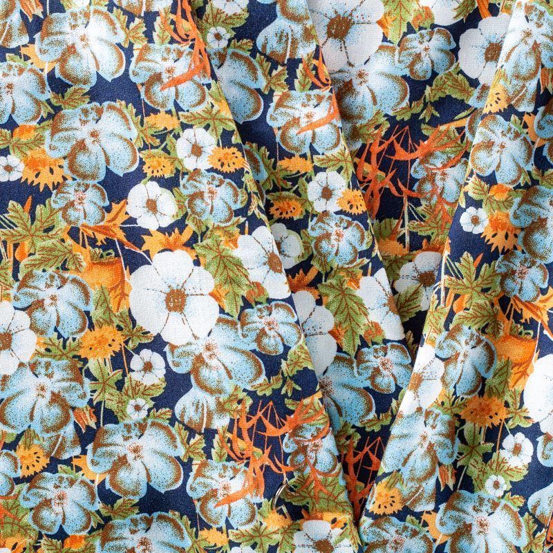 Плательно-блузочный штапель с цветочным принтом в бело-голубых оттеннках на темно-синем фоне. Мягкий, тонкий, нежный, пластичный, приятный на ощупь, хорошо драпируется, практичный. Подойдет для пошива платья, топа, блузки, рубашки, юбки, летних брюк.