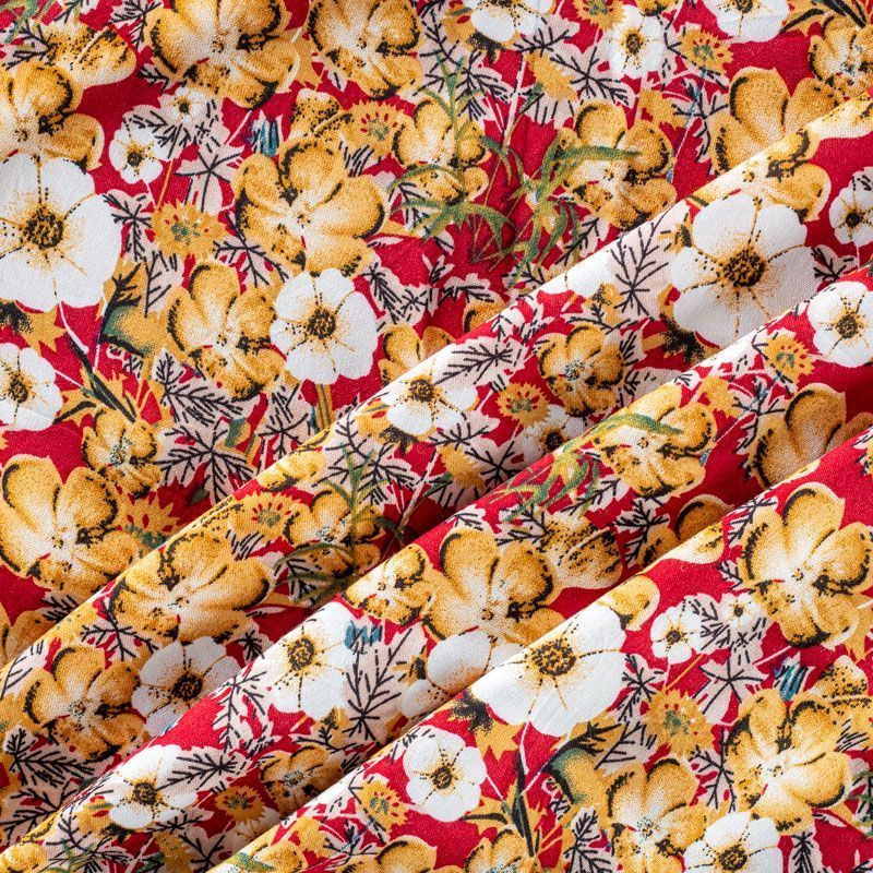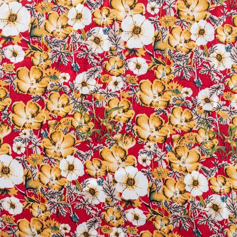 Плательно-блузочный штапель с цветочным принтом в молочно-бежевых оттеннках на бордовом фоне. Мягкий, тонкий, нежный, пластичный, приятный на ощупь, хорошо драпируется, практичный. Подойдет для пошива платья, топа, блузки, рубашки, юбки, летних брюк.