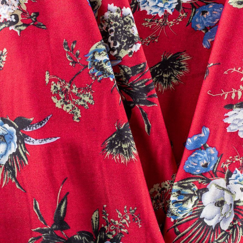 Плательно-блузочный штапель с цветочным принтом на сочном вишневом фоне. Мягкий, тонкий, нежный, пластичный, приятный на ощупь, хорошо драпируется, практичный. Подойдет для пошива платья, топа, блузки, рубашки, юбки, летних брюк.