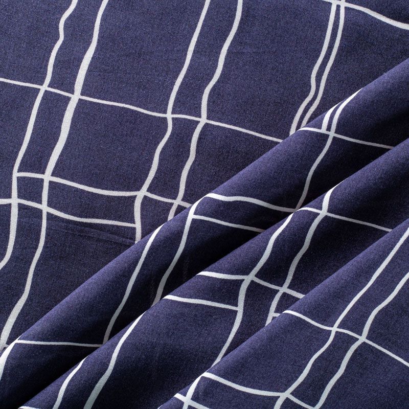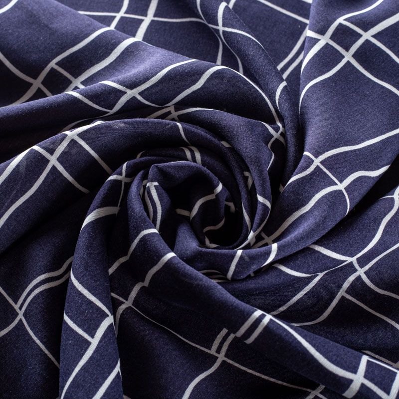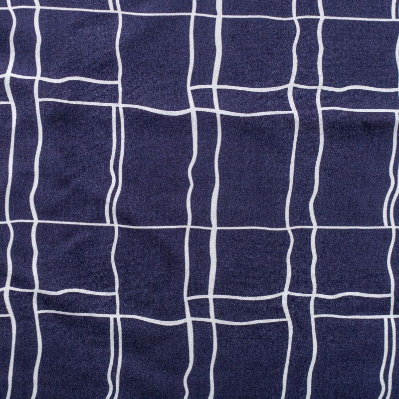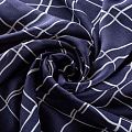 Плательно-блузочный штапель с геометрическим принтом, образующим клетку, на темно-синем фоне. Мягкий, тонкий, нежный, пластичный, приятный на ощупь, хорошо драпируется, практичный. Подойдет для пошива платья, топа, блузки, рубашки, юбки, летних брюк.