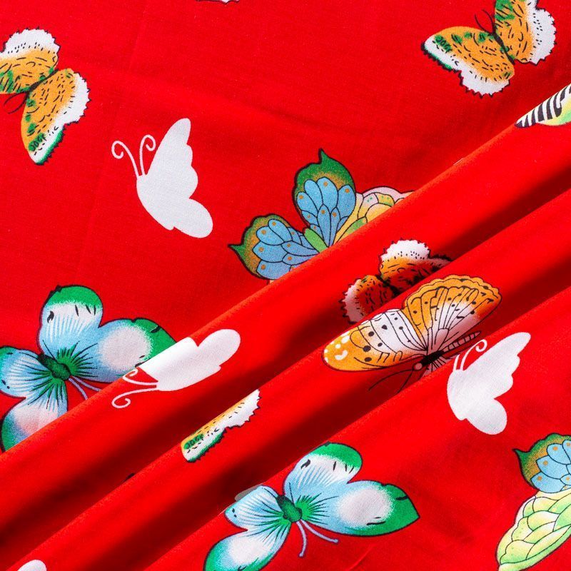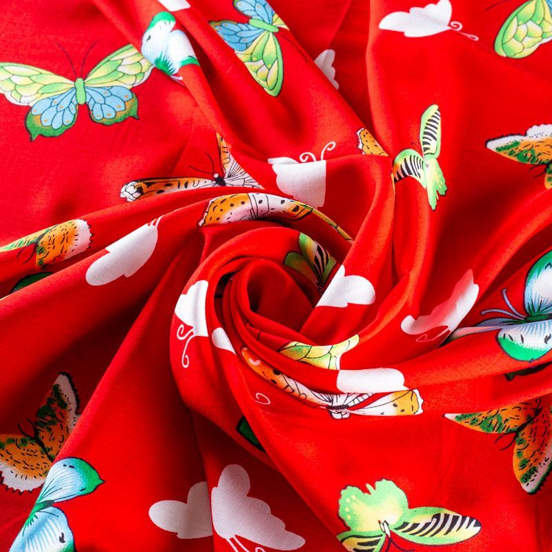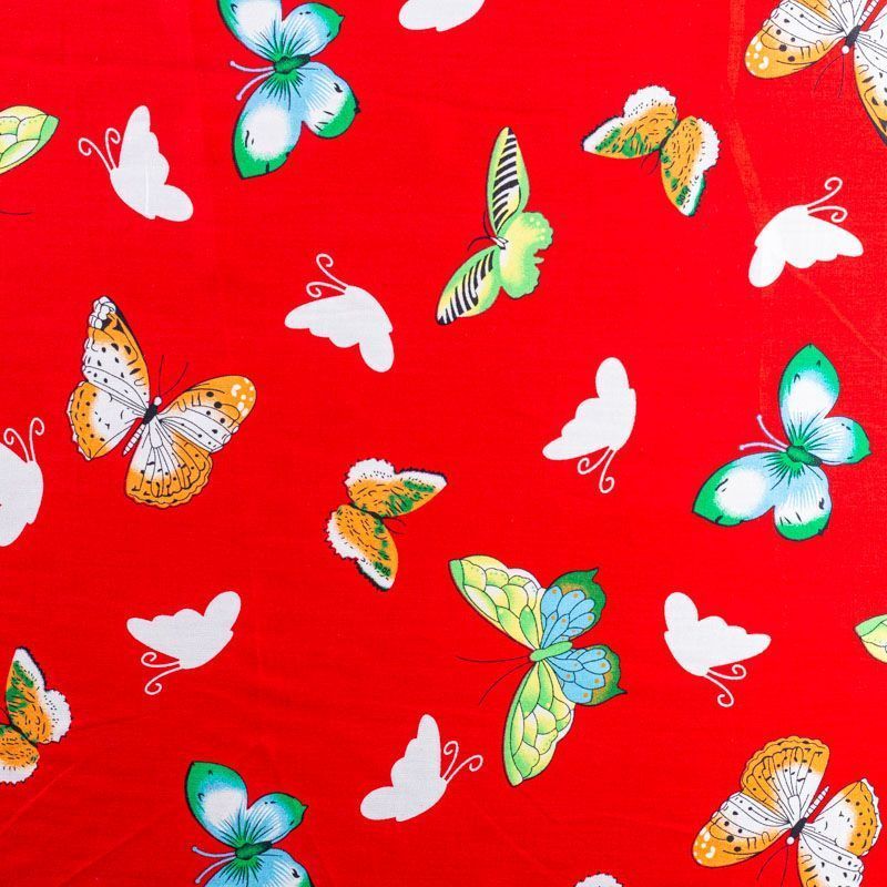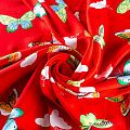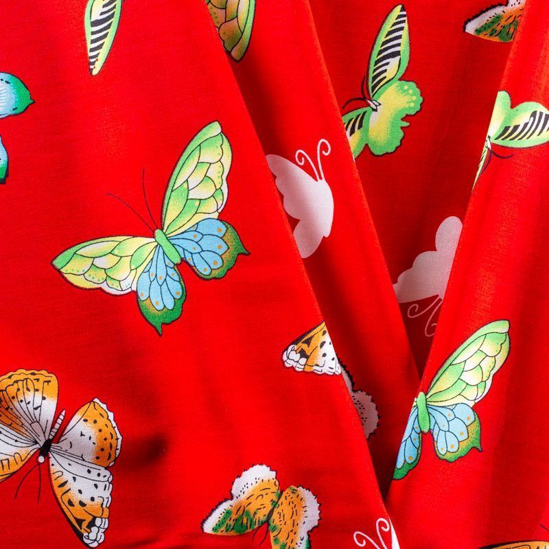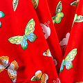 Плательно-блузочный штапель с романтичным принтом в виде цветных стилизованных бабочек на красном фоне. Мягкий, тонкий, нежный, пластичный, приятный на ощупь, хорошо драпируется, практичный. Подойдет для пошива платья, топа, блузки, рубашки, юбки, летних брюк.