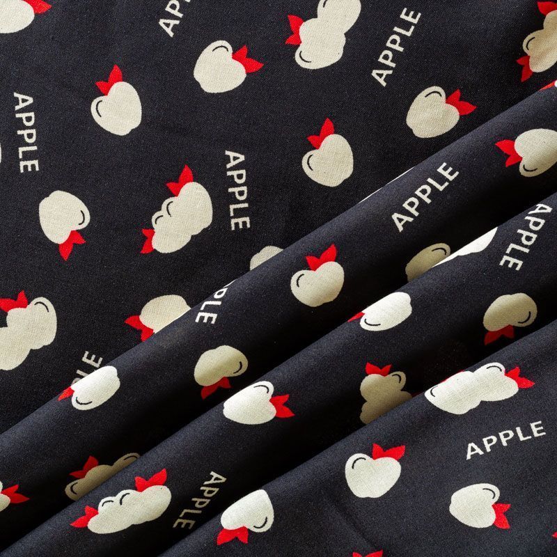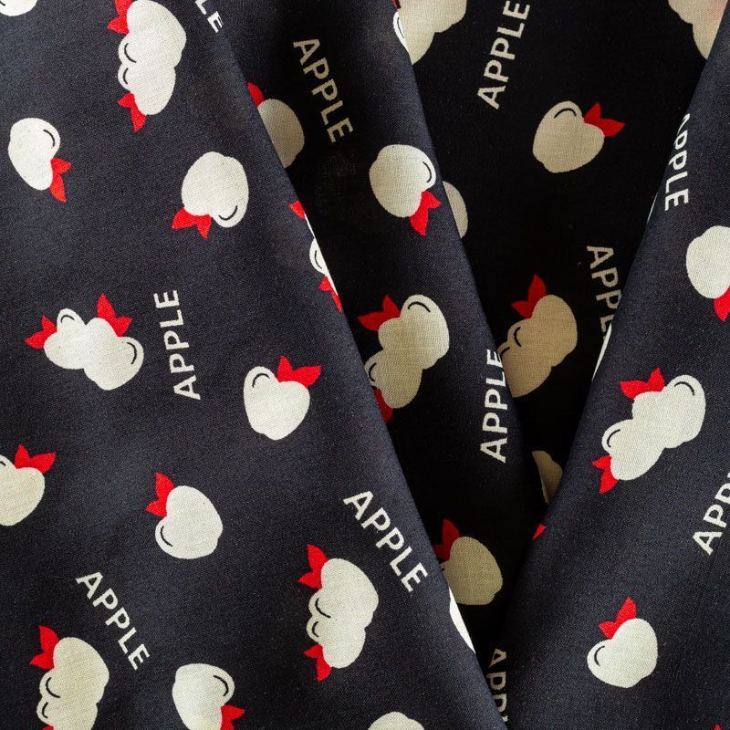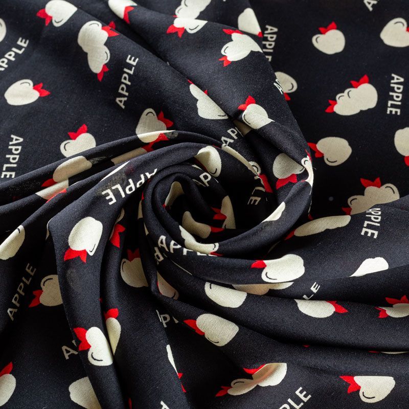 Плательно-блузочный штапель черного оттенка со стилизованными фруктами и надписями. Ткань мягкая, тонкая, нежная, пластичная, приятная на ощупь, хорошо драпируется, практичная, поверхность слегка фактурная. Подойдет для пошива платья, топа, блузки, рубашки, юбки, летних брюк.