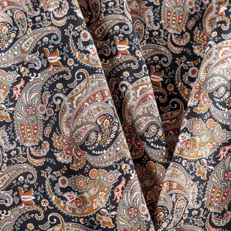 Плательно-блузочный штапель с богатым узором пейсли в серо-коричневых тонах на черном фоне. Мягкий, тонкий, нежный, пластичный, приятный на ощупь, хорошо драпируется, практичный. Подойдет для пошива платья, топа, блузки, рубашки, юбки, летних брюк, комбинезона.