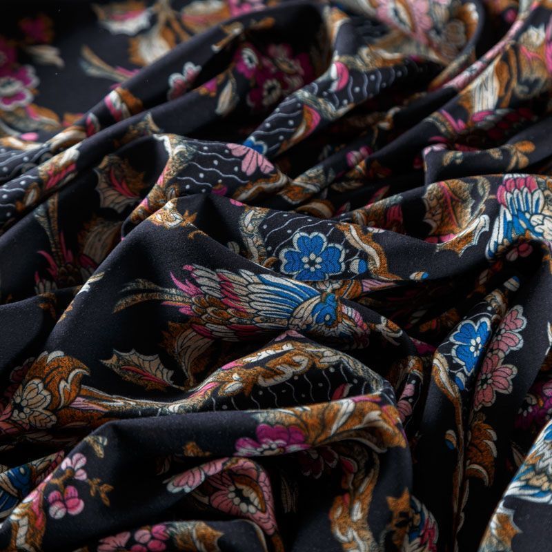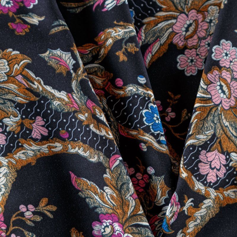 Плательно-блузочный штапель черного цвета с флористическим принтом. Ткань мягкая, тонкая, нежная и пластичная, приятная на ощупь, хорошо драпируется, практичная. Подойдет для пошива платья, топа, блузки, рубашки, юбки, летних брюк.