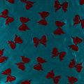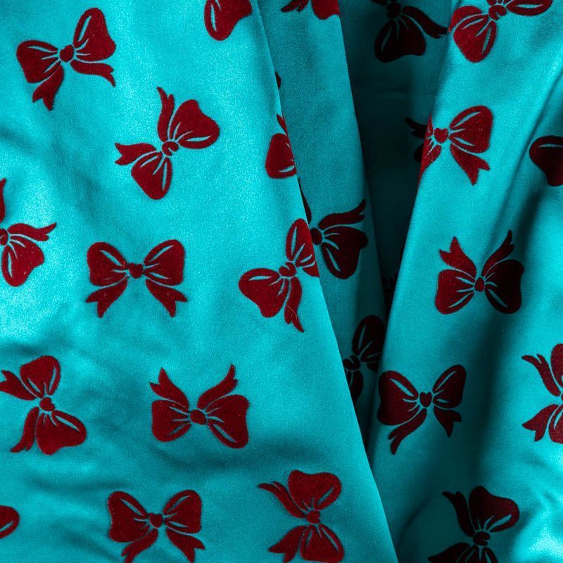 Шелковая тафта насыщенного цвета тиффани с романтичными банктиками вишневого цвета. Ткань тонкая, но плотная, отлично держит форму, драпируется красивыми жесткими складками и загибами. Фактура гладкая, с матовым блеском. На ощупь приятная, слегка шуршащая. Идеальна для пошива нарядных пышных платьев и юбо, вечерних костюмов, плащей и легких пальто.