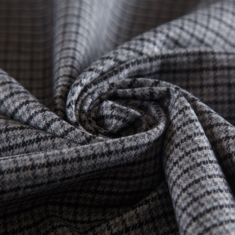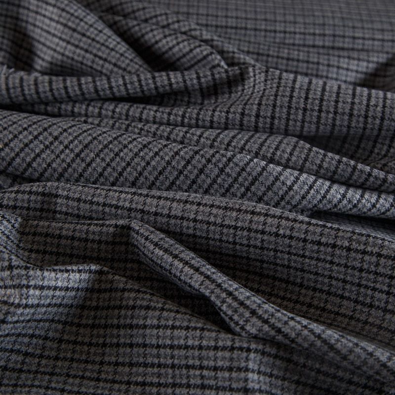 Итальянская костюмно-плательная смесовая ткань средней плотности, не сухая, пластичная, приятная на ощупь, почти не мнется, хорошо драпируется. Мелкая клетка образована за счет сочетания полос черного и серого оттенков. Ткань отлично подойдет на костюм, жилет, жакет, легкое пальто, юбку, брюки, платье, сарафан, шорты.