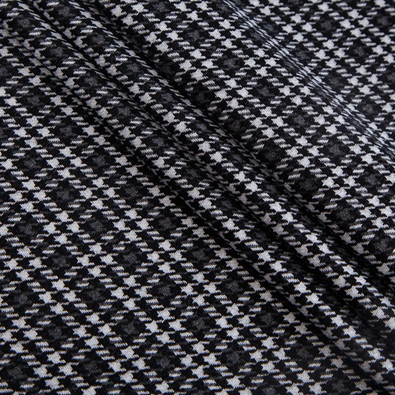 Итальянская костюмно-плательная смесовая ткань средней плотности в белом оттенке в мелкую серо-черную клетку. Ткань не сухая, формоустойчивая, пластичная, приятная на ощупь, почти не мнется, хорошо драпируется. Ткань отлично подойдет на костюм, жилет, жакет, легкое пальто, юбку, брюки, платье, сарафан, шорты.