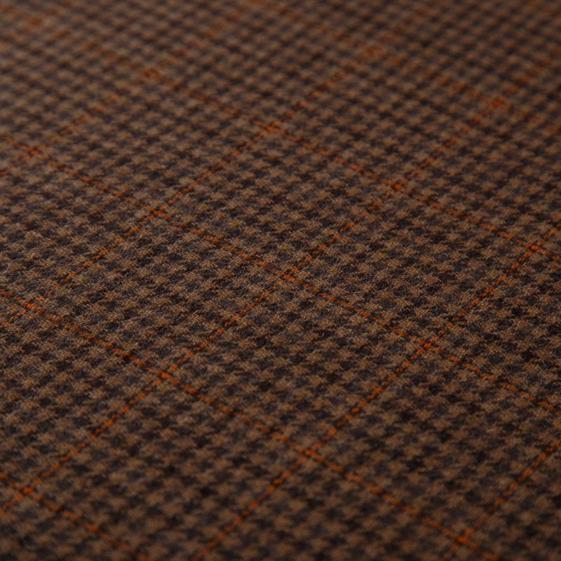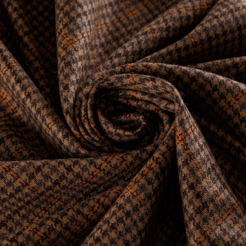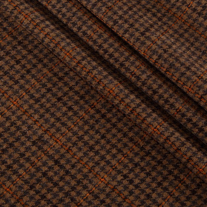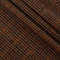 Итальянская костюмно-плательная шерсть средней плотности в коричневом оттенке в клетку тартан. Ткань не сухая, тонкая, пластичная, приятная на ощупь, почти не мнется, хорошо драпируется, тянется за счет эластана в составе. Отлично подойдет на костюм, жилет, жакет, легкое пальто, юбку, брюки, платье, сарафан, шорты.