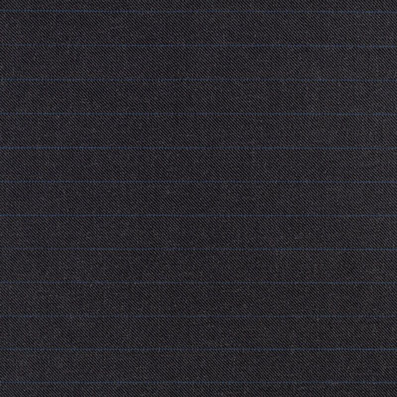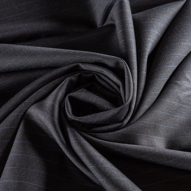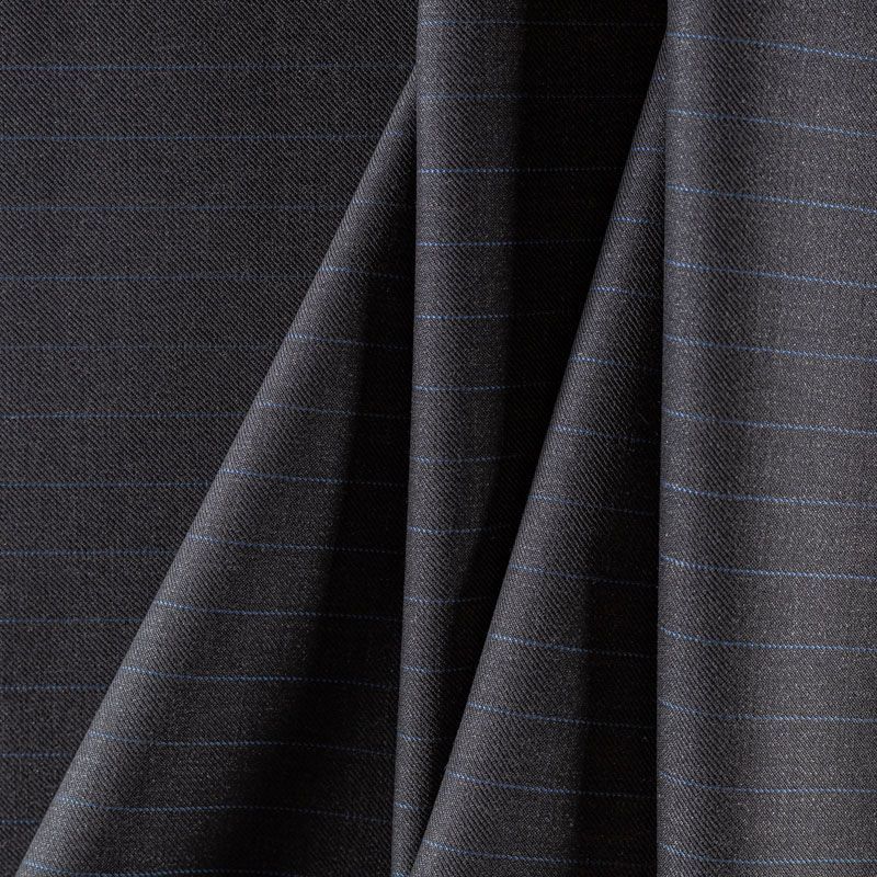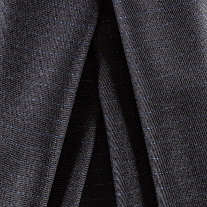 Костюмно-плательная ткань средней плотности, приятная на ощупь. На черном фоне очень тонкая полоска синего оттенка, направление - вдоль кромки. Прекрасно подойдет для пошива брюк-палацио, жакета, платья по фигуре, сарафана, классического мужского или женского костюма.