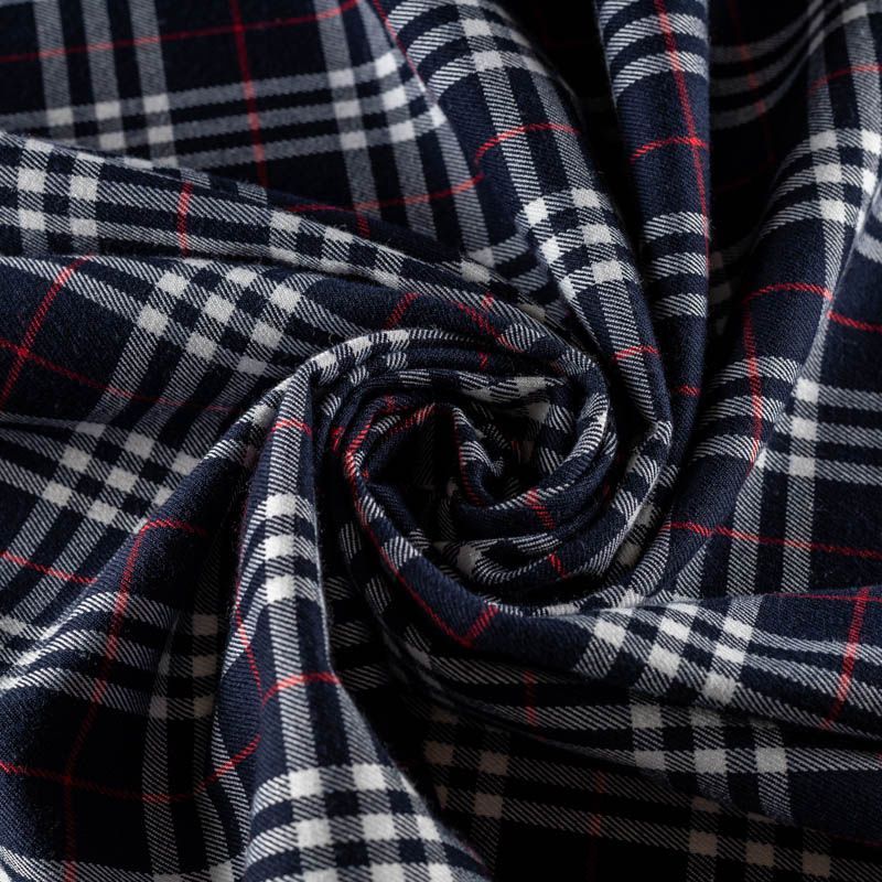 Ткань средней плотности, мягкая и приятная на ощупь, немного тянется, формоустойчива, хорошо драпируется и образует мягкие складки. Сочетание линий белого и красного цветов на темно-синем фоне образует сложную красивую клетку. Ткань отлично подойдет на костюмы, юбки, брюки, платья, жакеты, для школьной формы.