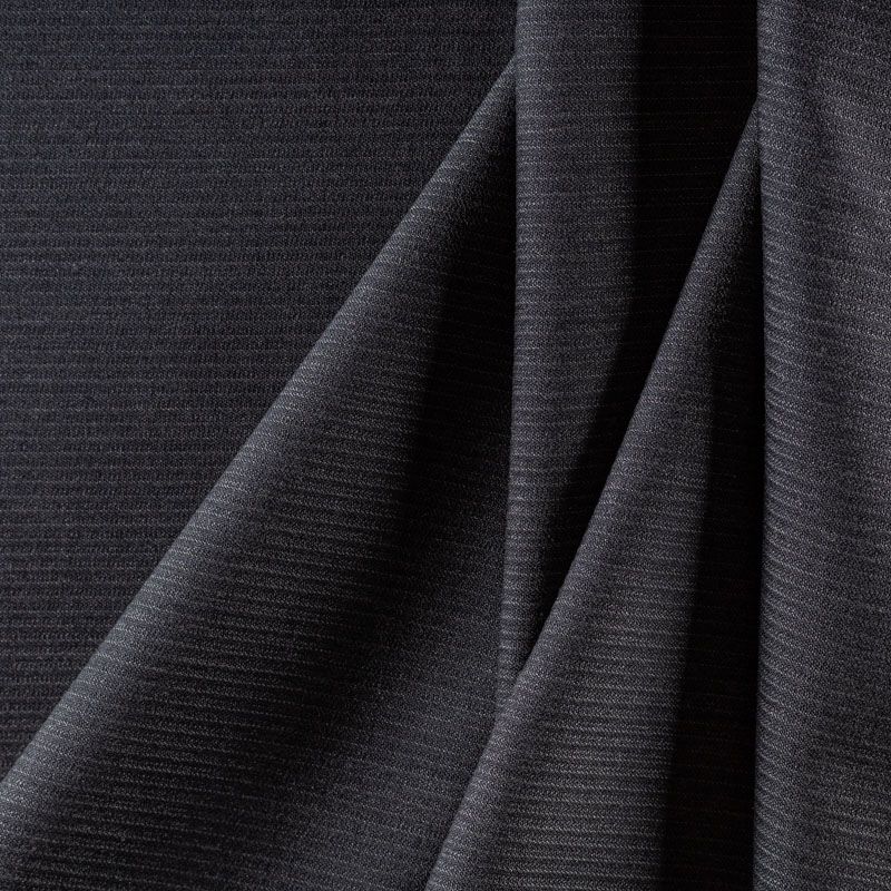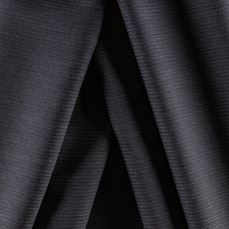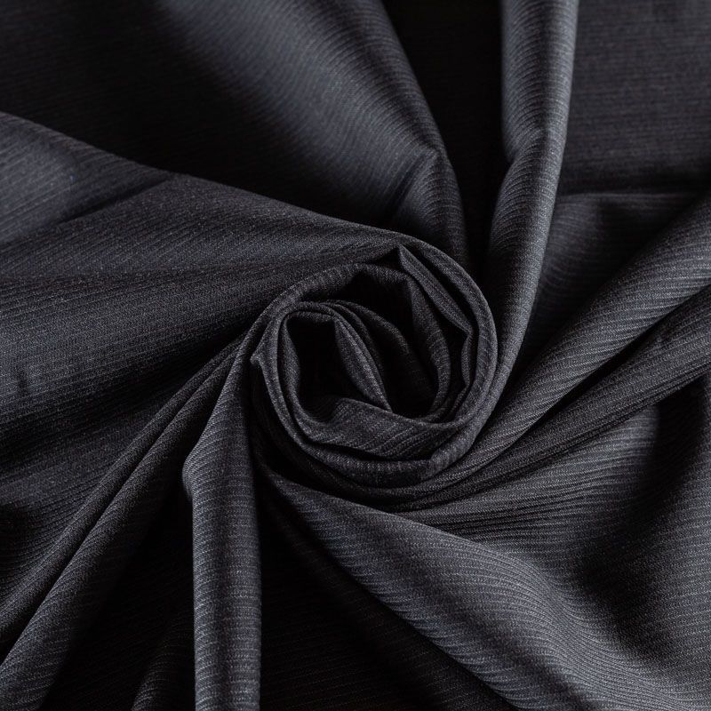 Костюмно-плательная ткань средней плотности, немного суховата, ноприятная на ощупь. На графитовом фоне очень тонкая и узкая полоска светло-серого оттенка, направление - вдоль кромки. Прекрасно подойдет для пошива брюк-палацио, жакета, платья по фигуре, сарафана, классического мужского или женского костюма.