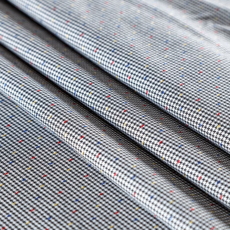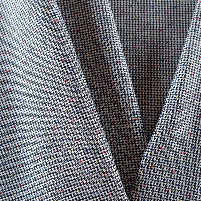 Костюмно-плательная ткань средней плотности с добавлением вискозы. Мягкая, пластичная, с мелким геометрическим принтом - гусиная лапка в черно-белой гамме. Полотно очень приятное на ощупь, не мнется, не сухое, отлично драпируется. Идеально подойдет для костюма, жакета или жилета, брюк, а также юбок и платьев.