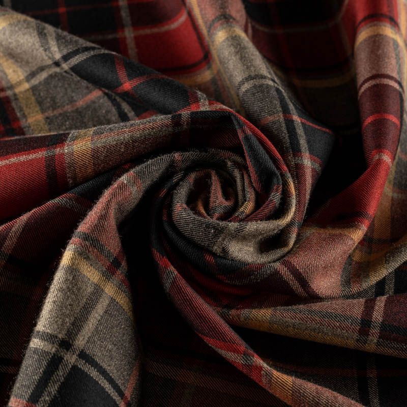 Костюмная шотландка плотная, но не толстая, мягкая и приятная на ощупь, немного тянется, формоустойчива, хорошо драпируется и образует мягкие складки. Сочетание линий красного, черного, терракотового и желтого цветов образует сложную красивую клетку тартан. Ткань отлично подойдет на костюмы, юбки, брюки, платья, жакеты.