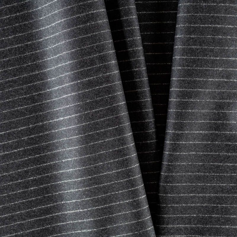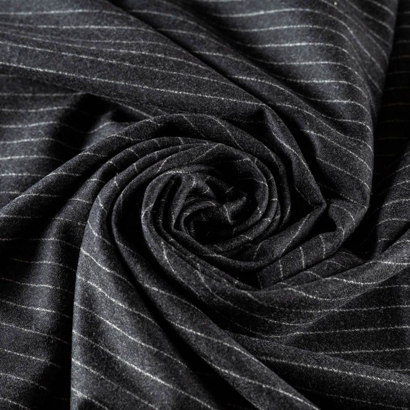 Костюмно-плательная шерстяная ткань с добавлением шелка средней плотности, мягкая, пластичная, хорошо драпируется и ниспадает. Очень теплая, уютная, не колется, в носке очень комфортная. Поверхность с небольшими ворсинками, шелковистая на ощупь. Тонкая белая вертикальная полоска добавляет элегантности и изысканности классическому серому оттенку. Подойдет для пошива стильного платья прямого или расклешенного силуэта для сезона осень-зима,  юбки, теплого костюма, жакетов, брюк.
