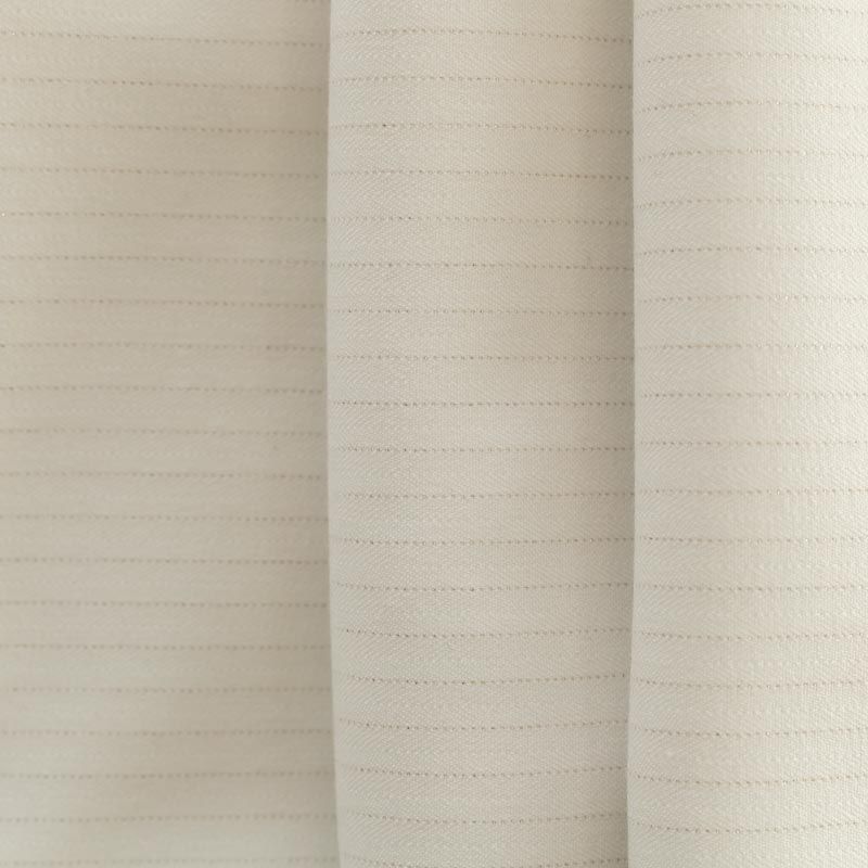Достаточно плотная костюмно-плательная ткань, мягкая и приятная на ощупь, немного тянется, формоустойчива, хорошо драпируется и образует мягкие складки.  Элегантный молочный цвет ткани украшает тончайшая золотистая люрексная вертикальная полоска. Ткань отлично подойдет на костюмы, юбки, брюки-палацио, платья, жакеты.