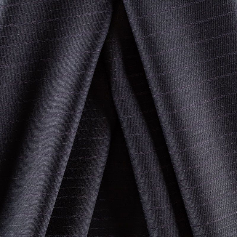 Костюмно-плательная ткань средней плотности, немного суховата, приятная на ощупь. На графитовом фоне очень тонкая полоска сиреневого оттенка, направление - вдоль кромки. Прекрасно подойдет для пошива брюк-палацио, жакета, платья по фигуре, сарафана, классического мужского или женского костюма.