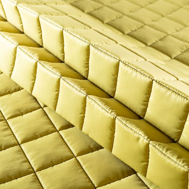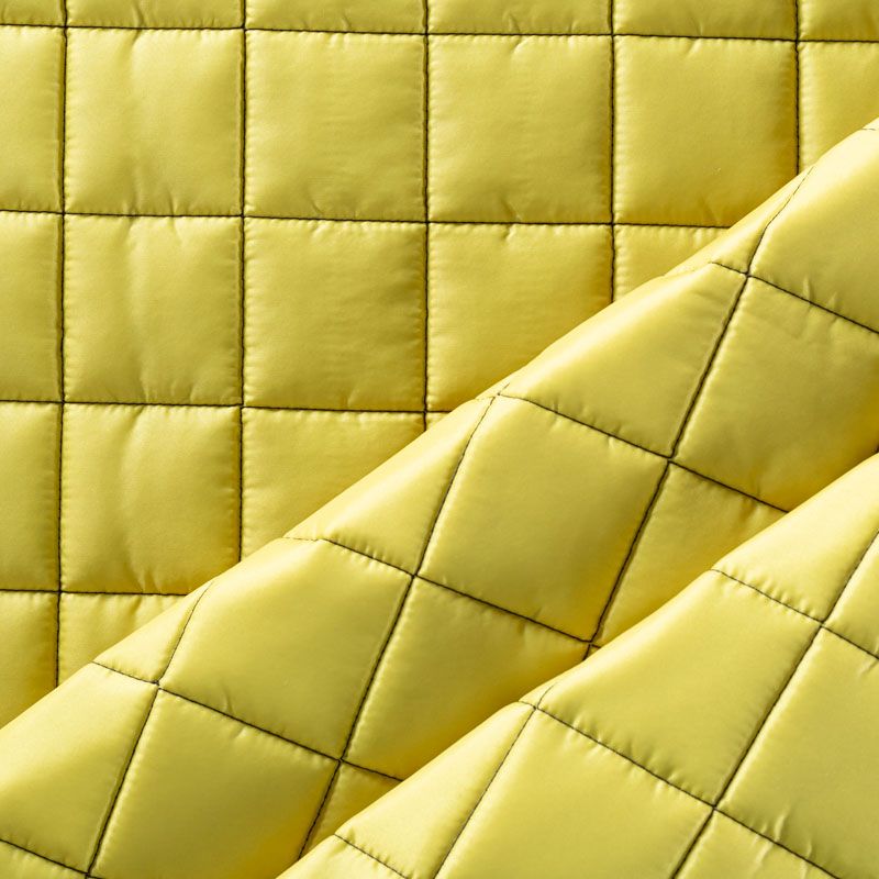 Трехслойная итальянская курточная ткань желто-зеленого оттенка, простеганная не крупными квадратами. Нижний слой черного цвета, заменяет подклад, средний слой - синтепон, верхний слой - матовый полиэстер, напоминающий болонь. Ткань легкая, пластичная, хорошо держит форму. Прекрасно подойдет для пошива легких пальто, курток, бомберов, жилетов, накидок-кейпов, объемных сумок, одежды для домашних питомцев, туристического снаряжения.