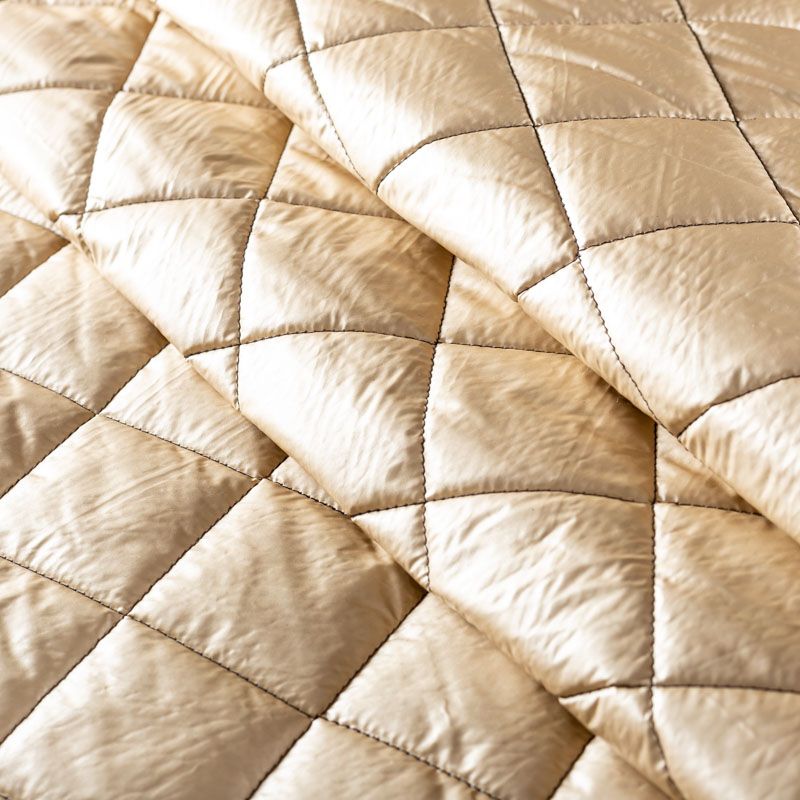 Трехслойная итальянская курточная ткань золотисто-бежевого оттенка с легким эффектом металлик, простеганная не крупными ромбами размером 3х3 см. Нижний, черного цвета, заменяет подклад и верхний слой - полиэстер, по качеству напоминает болонь, между ними синтепон. Ткань легкая, пластичная, хорошо драпируется. Прекрасно подойдет для пошива легких пальто, курток, бомберов, жилетов, накидок-кейпов, объемных сумок, одежды для домашних питомцев, туристического снаряжения.