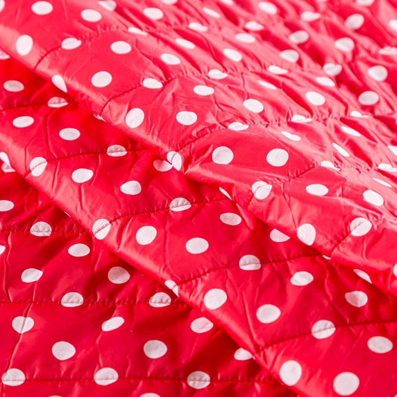 Двухслойная курточная ткань красного оттенка в белый горох, простеганная вертикальными линиями вдоль кромки. Нижний слой - синтепон, верхний - полиэстер, по качеству напоминает болонь. Очень мягкая и легкая, пластичная, хорошо драпируется. Прекрасно подойдет для  пошива легких пальто, курток, жилетов, накидок-кейпов, объемных сумок.