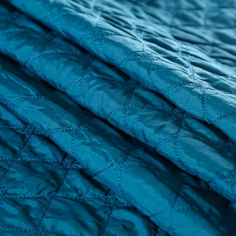 Двухслойная курточная ткань сине-зеленого оттенка, с геометрической стежкой нитками в тон полотну. Нижний слой - синтепон, верхний - полиэстер, по качеству напоминает болонь. Ткань легкая, пластичная, хорошо драпируется. Прекрасно подойдет для пошива пальто, курток, жилетов, накидок-кейпов, объемных сумок, одежды для домашних питомцев, туристического снаряжения.