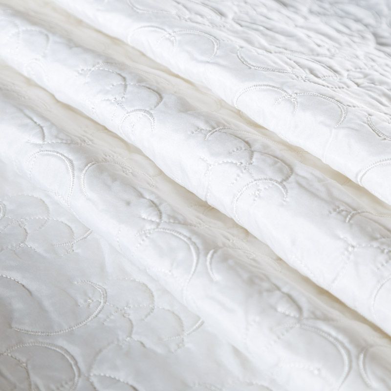 Двухслойная курточная ткань молочного оттенка, с абстрактной стежкой нитками в тон полотну. Нижний слой - синтепон, верхний - полиэстер, по качеству напоминает болонь. Ткань легкая, пластичная, хорошо драпируется. Прекрасно подойдет для пошива пальто, курток, жилетов, накидок-кейпов, объемных сумок, одежды для домашних питомцев, туристического снаряжения.