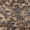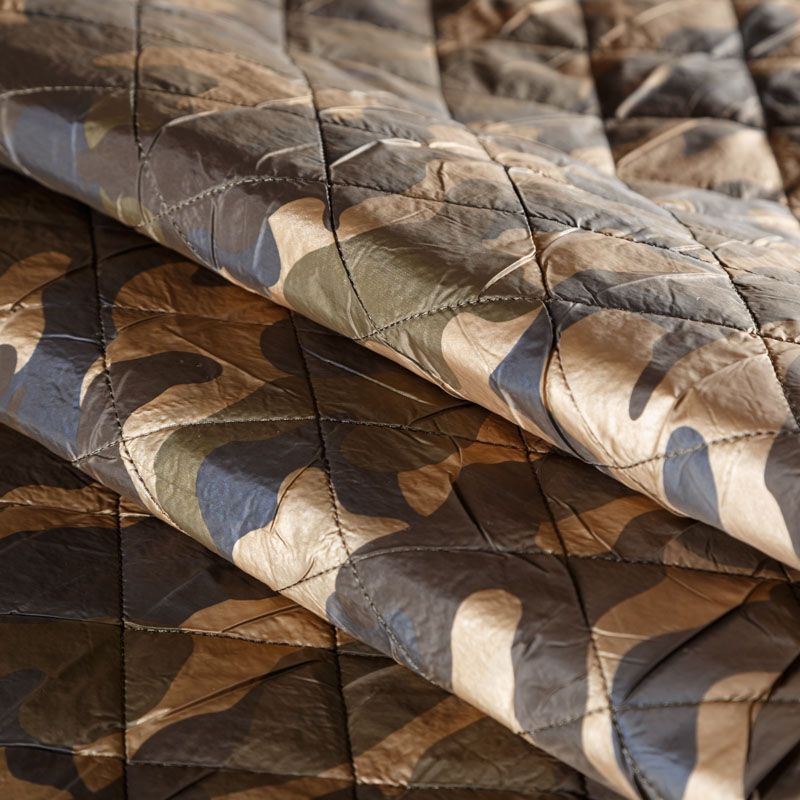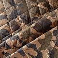 Двухслойная курточная ткань золотистого оттенка с оригинальным камуфлированным принтом, простеганная не крупными ромбами размером 4х4 см. Нижний слой - синтепон, верхний - полиэстер, по качеству напоминает болонь. Очень мягкая и легкая, пластичная, хорошо драпируется. Прекрасно подойдет для  пошива легких пальто, курток, жилетов, накидок-кейпов, объемных сумок.