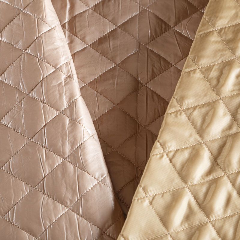 Трехслойная курточная ткань бежевого оттенка, простеганная не крупными ромбами. Нижний слой - матовый фактурный полиэстер, средний - тонкий синтепон, верхний - глянцевая гладкая плащевка. Очень мягкая и легкая, пластичная, хорошо драпируется. Прекрасно подойдет для  пошива легких пальто, бомберов, парки, курток, жилетов, накидок-кейпов, объемных сумок.