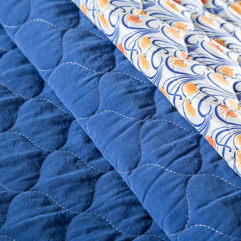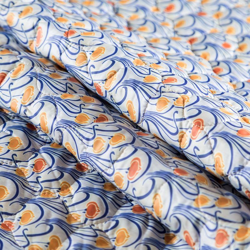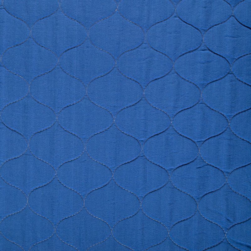 Трехслойная итальянская курточная ткань светлого оттенка со стилизованным узором в желто-синих цветах, простеганная фигурными линиями. Нижний слой синего цвета, средний слой - синтепон, верхний слой - принтованный матовый полиэстер. Ткань легкая, пластичная, хорошо драпируется. Прекрасно подойдет для  пошива легких пальто, курток, бомберов, жилетов, накидок-кейпов, объемных сумок, одежды для домашних питомцев, туристического снаряжения.