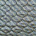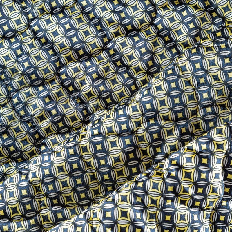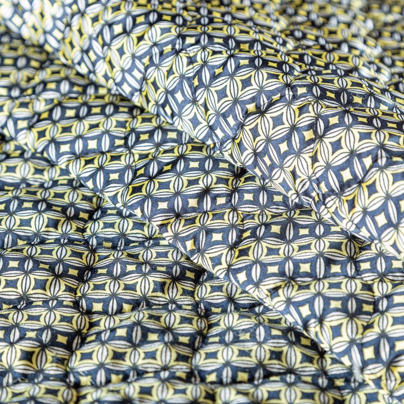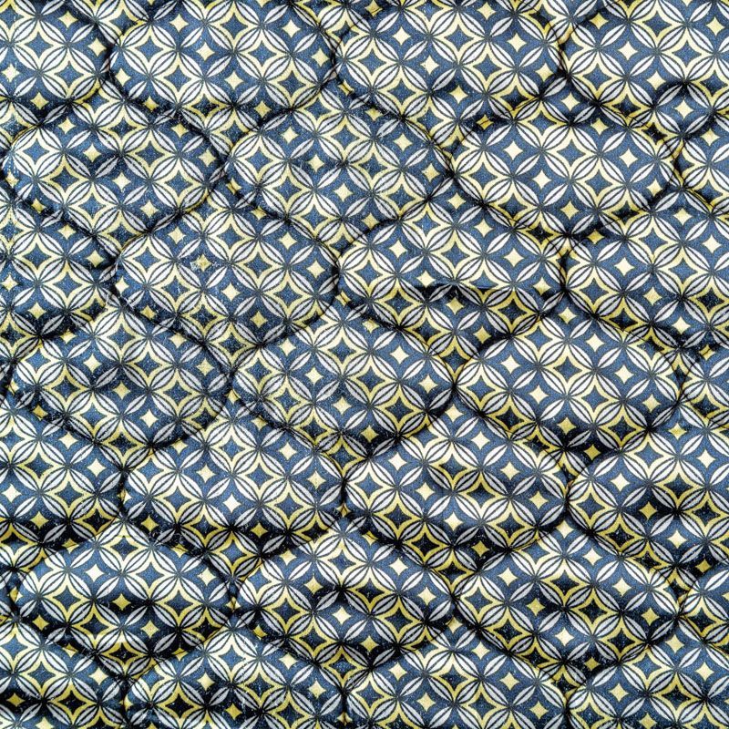 Трехслойная итальянская курточная ткань светлого оттенка со стилизованным геометрическим узором в желто-синих цветах, простеганная фигурными линиями. Нижний слой белого цвета, средний слой - синтепон, верхний слой - принтованный матовый полиэстер. Ткань легкая, пластичная, хорошо драпируется. Прекрасно подойдет для  пошива легких пальто, курток, бомберов, жилетов, накидок-кейпов, комбинезонов, объемных сумок, одежды для домашних питомцев, туристического снаряжения.