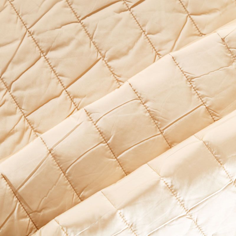 Итальяская трехслойная двухсторонняя курточная ткань бежевого оттенка, простеганная широкими полосами вдоль кромки. Средний слой - воздушный синтепоновый утеплитель, нижний и верхний - матовая плотная плащевая ткань. Очень мягкая и легкая, пластичная, хорошо драпируется. Прекрасно подойдет для  пошива легких пальто, бомберов, парки, курток, жилетов, накидок-кейпов, объемных сумок.