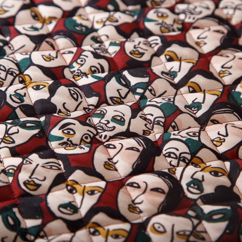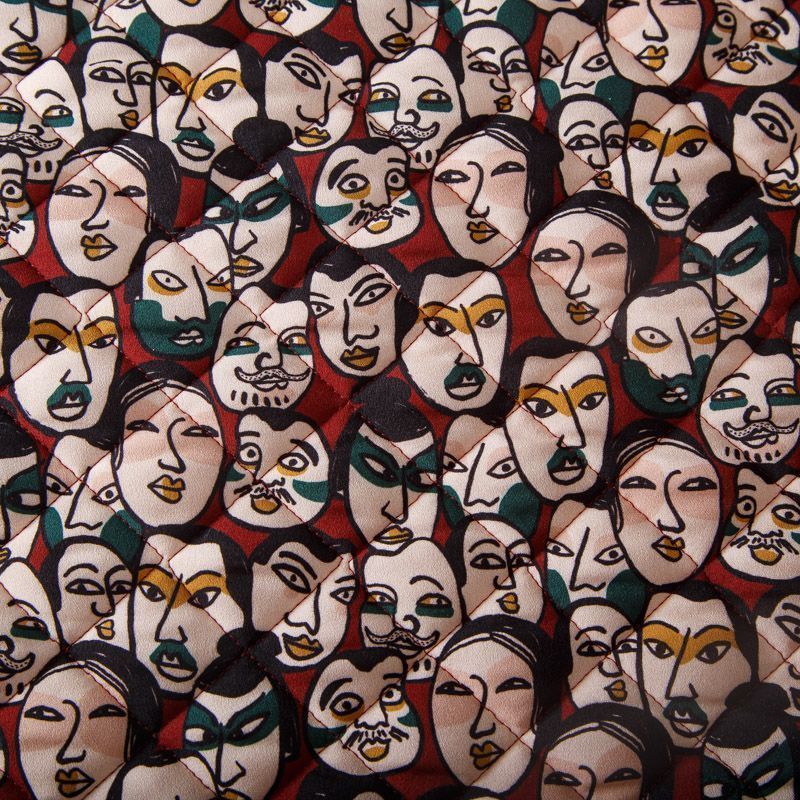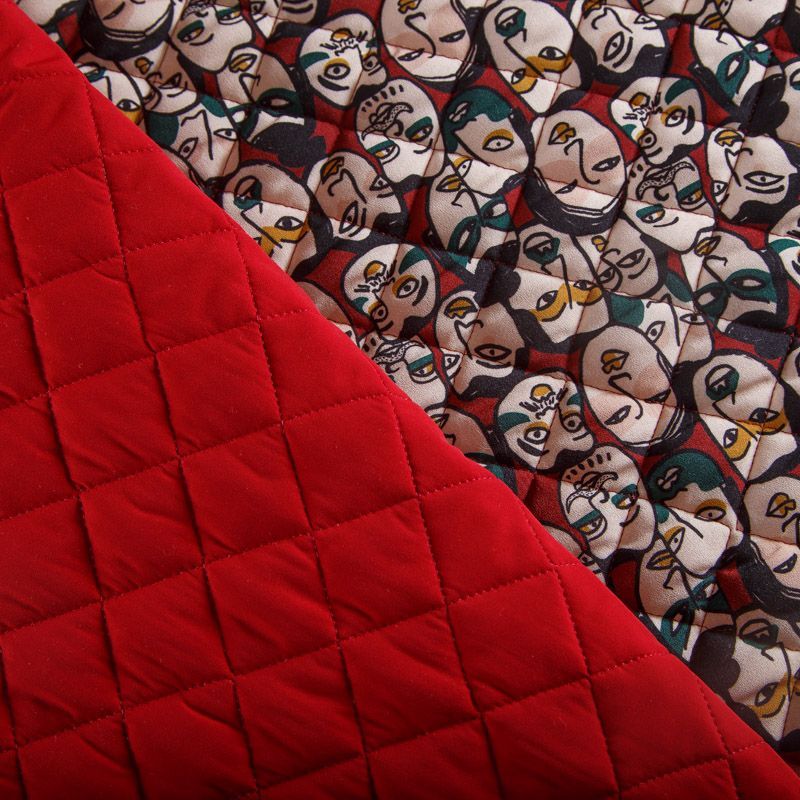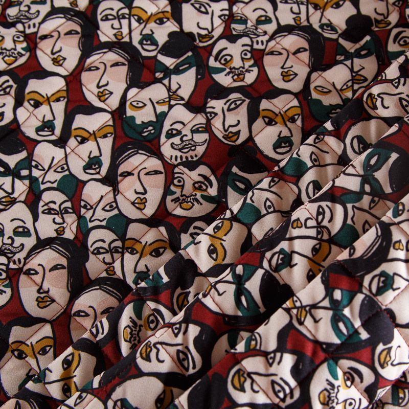Итальянская трехслойная курточная ткань вишневого оттенка цвета с абстрактным принтом, простеганная ромбами. Нижний слой - гладкий матовый полиэстер красного цвета, средний слой - синтепон, верхний - принтованный креп-шифон. Очень мягкая и легкая, пластичная, хорошо драпируется. Прекрасно подойдет для  пошива легких пальто, бомберов, парки, курток, жилетов, накидок-кейпов, объемных сумок.